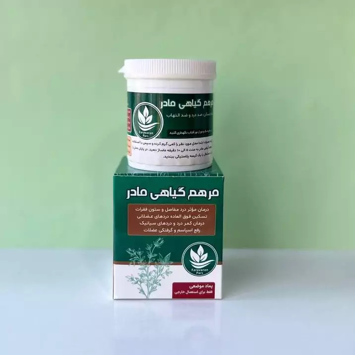 📌مرهم گیاهی مادر کرم گیاهی درد کمردرد پا درد مفاصل گرفتگی عضلات 🔶کاربرد این مرهم در موارد زیر به طور کامل اثبات شده است: 1- تسکین مؤثر دردهای مفصلی: این مرهم در تسکین دردهای مفصلی عملکردی عالی دارد و تاثیر طولانی مدتی در این زمینه دارد. با این حال، هیچ ادعایی در در..مان آرتروز ندارد. 2- د..رمان گرفتگیهای عضلانی: تاثیر چشمگیر این مرهم در د.ر.مان گرفتگیهای عضلانی مشهود است و باعث افزایش جریان خون در محل استعمال میشود. 3- رفع کامل کوفتگی و خستگی: این مرهم برای رفع حالات کوفتگی و خستگی، به خصوص برای ورزشکاران و افرادی که به انجام کارهای سنگین فیزیکی مبادرت میکنند، بسیار مفید است. 4- بهبود پیچ خوردگی: مرهم گیاهی مادر باعث بهبود التهاب و کاهش درد محل پیچ خوردگی میشود. 5- رفع رگ به رگ شدگی: مالش ملایم محل مورد نظر با این مرهم بهبود رگ به رگ شدگی را میآورد و در رفع التهاب و گرفتگی موثر است.